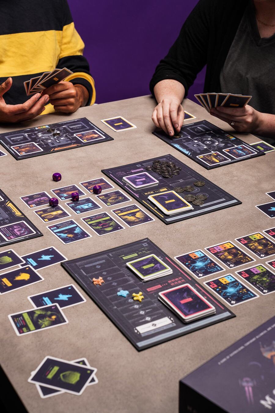 A tabletop game of shipbuilding, temporary alliances, and shrewd negotiation moonraker. After negotiating terms with allies, players use their decks of action cards to play thrusters, shields, weapons, reactors, and crew to fulfill the requirements on each contract.